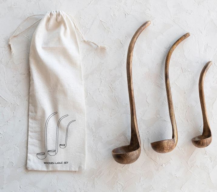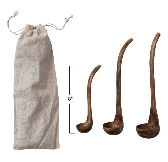 - Set Includes: 3 Ladles in a Printed Drawstring Bag